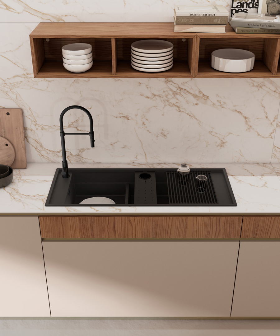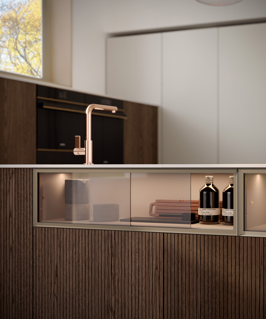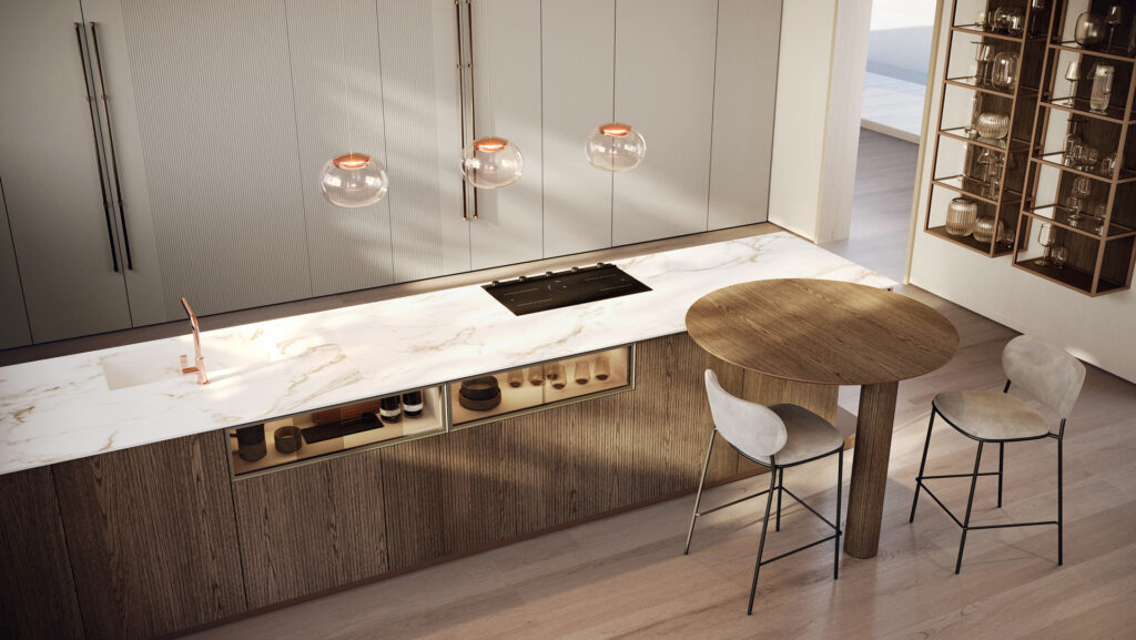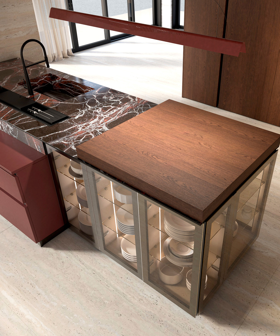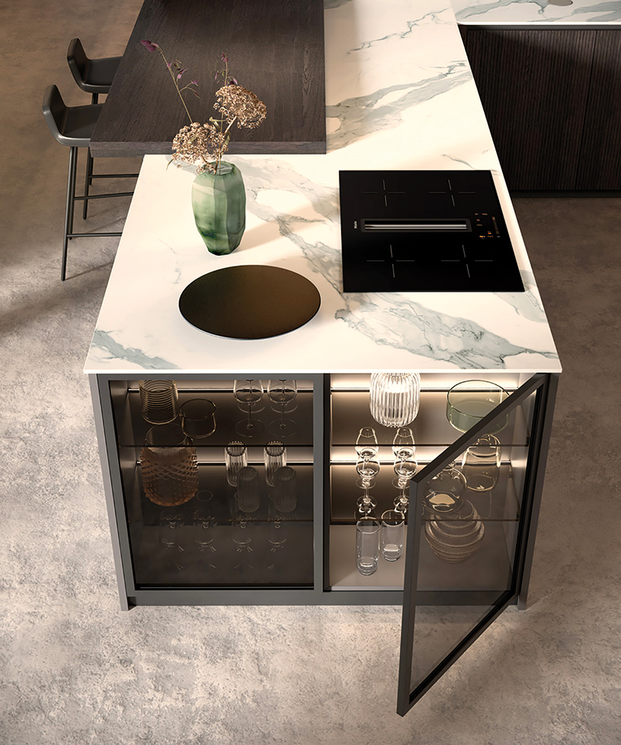 Progetti dal forte impatto estetico, capaci di esaltare le ante impiallacciate in legno affiancandole ad una vasta gamma di ante laccate, ante con telaio in alluminio e top in materiali ceramici dal grande fascino. Un sistema integrato cucina–dining in un insieme armonico e funzionale. Una cucina moderna estremamente funzionale ed affidabile, prodotta nel rispetto dell’ambiente con materiali e lavorazioni ecocompatibili, qualità garantita da un marchio italiano leader di settore che è il Gruppo Lube.